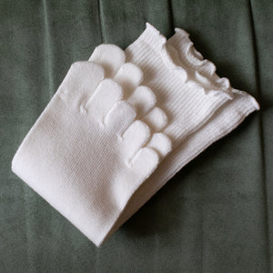 Los calcetines de cinco y dos dedos de Tabio se tejen utilizando nuestra tecnología única de tejido tridimensional para adaptarse perfectamente a la forma de tus dedos, permitiéndoles moverse