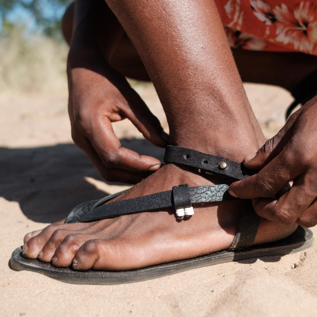 La San-Dal es una sandalia minimalista y natural hecha de cuero a mano por el pueblo Ju'/hoansi San del Desierto de Kalahari. Diseñada para fortalecer los pies y fomentar el movimiento ágil, este diseño ancestral ha sustentado a los San durante miles de años.