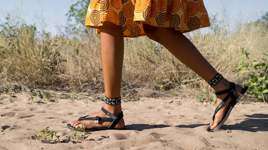 Estos elementos no solo enriquecen el diseño único del calzado, sino que también honran la cultura y las tradiciones de la comunidad Ju'/hoansi San, aportando un toque especial a esta experiencia de andar minimalista.